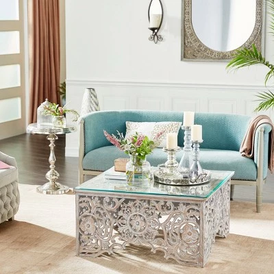 This coffee table will be the focal point in any living room space, add a touch of floral arrangement in the middle for a soft elegant appeal. Useful and elegant, coffee tables are more than just a pretty piece of furniture in front of your couch. Sit back, relax, but don’t put your feet up on this coffee table. This item ships in two cartons. Suitable for indoor use only. Maximum weight limit is 100 lbs. Made in India. Mediterranean theme