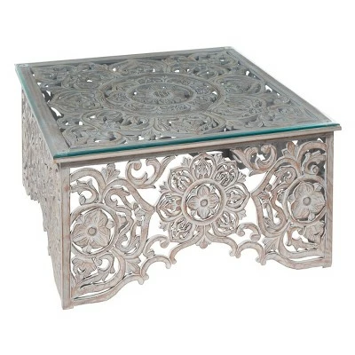 - An intricate carving of botanical floral are represented through out the frame of the table with a brilliantly clear glass top