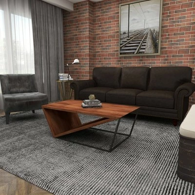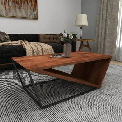 - Rectangle low wooden coffee table features two triangles, one mahogany wood and one iron, forming a versatile accent piece