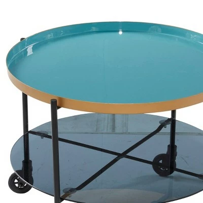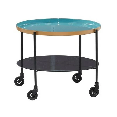 Contemporary interior concepts gain a versatile furniture piece in this ergonomic accent table. It has two tabletop surfaces, one iron, one enamel, which are supported by an iron frame with four wheels at the base. Use it as a coffee table in the living room or as a lampstand in the bedroom. It can hold mini potted plants, alarm clocks, magazines, light books, figurines, picture frames, and telephones. This table’s dimensions are 26″L X 26″W X 19″H.