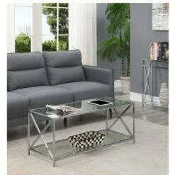 Complete your living space with the Oxford Chrome Coffee Table with Shelf from Breighton Home as your centerpiece. This contemporary table will bring glamour and functionality anywhere it stands. Showcasing two shelving tiers crafted from tempered clear glass and a metal chrome frame, it is designed to create a spacious ambience. The shelving offers plenty of space for all your living room essentials including displays. The removable glass tiers make it easy for cleaning maintenance. Simple and 3 easy step assembly will have you and your friends admiring its updated classical beauty in no time. Look for matching pieces from the Oxford Chrome Collection from Breighton Home, each sold separately.