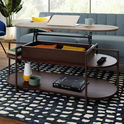 It’s proven that rounded edges bring a sense of calm to any space. With this modern lift-top coffee table from the Radial® collection, you can bring that sought-after cool aesthetic while still turning heads. This pop-up coffee table features a top that lifts up and forward to create a versatile surface for home projects, work from home activities or essential munching on your favorite snacks. Hidden storage beneath the lift-top conveniently holds blankets, magazines, and remotes to keep the top surface clutter free. This lift-top coffee table with storage features a lower shelf that is perfect for additional storage of display of home dĂ©cor, organizing bins and much more. Finished on all sides for versatile placement in any room in your home, this coffee table with lift-top will look good from every angle. With a texture, powder coated metal frame, Umber Wood™ finish, and a faux Deco Stone accent top surface, this modern lift-top coffee table is the perfect centerpiece to any living room.