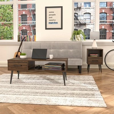 Add mid-century modern styling to your living room with the Ameriwood Home Wilson Coffee Table. Made of laminated particleboard, the classic walnut woodgrain finish will add an upgraded look to your space. The spacious tabletop is perfect for remotes, snacks, and decorations. The open shelf can be accessed from both sides of the table and can hold reading materials and electronics to keep your tabletop clutter-free. The drawer is ideal for smaller items and extra cords. The Coffee Table ships flat to your door and requires assembly upon opening. Two adults are recommended to assemble. Once assembled, the Coffee Table measures to be 17.99”H x 41.93”W x 19.49”D.