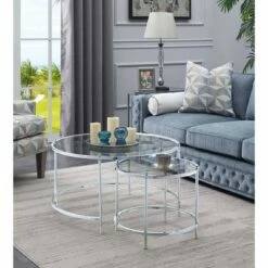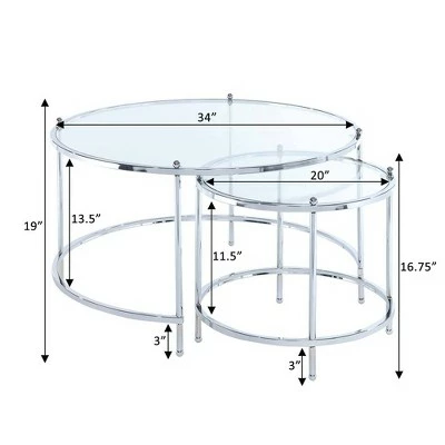 A must have 2 piece unit for your home, the Royal Crest Nesting Coffee Table brings topnotch style and functionality. With its nested design, it creates a multi level display that will become the center of attention in your abode. The beautiful craftsmanship is undeniable as this set is made from chromed metal and tempered clear glass inserts. The round tabletops provide enough space for your favorite centerpiece along with your living room essentials. Nest together when needed or use both glass tables when having multiple guests over for a cup of coffee. Assembles in just 4 steps with no tools required! Look for additional glam style items from the Royal Crest Collection and complete the look today! Each sold separately.