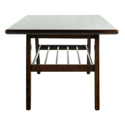 A contemporary spin with vintage influenced style, this two tier coffee table elevates any interior. Its substantial dark walnut finish complements any décor and solid clean top is inviting to be decorated by coffee books and more. Otherwise, utilize its black metal open storage rack underneath to ensure that everyday necessities are neatly tucked away and kept out of sight. The Seth 2 tier coffee table requires assembly and is a wonderful addition for contemporary and modern styled rooms.