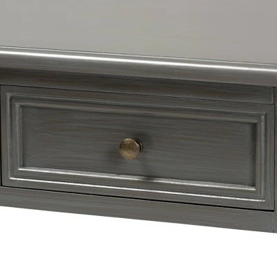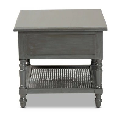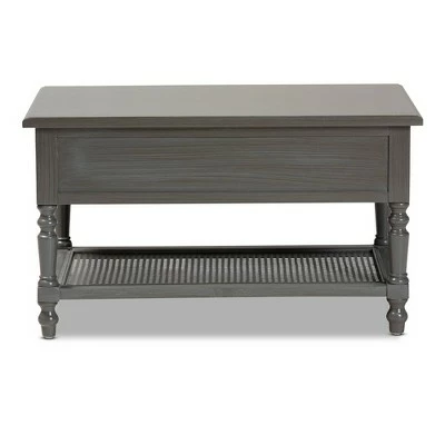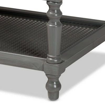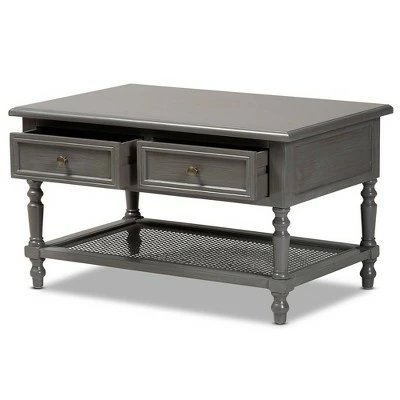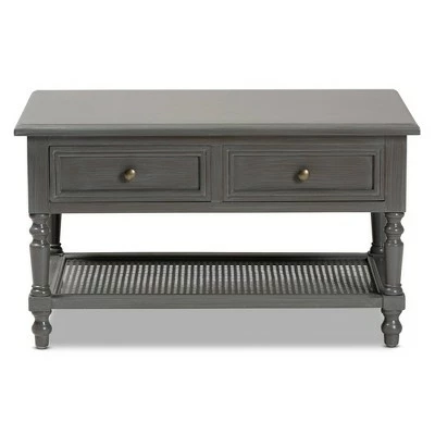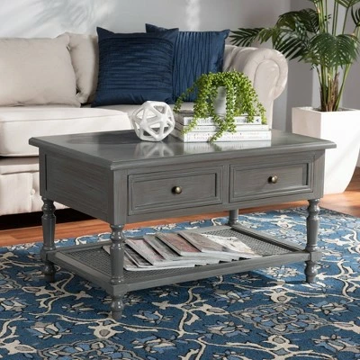 Arrange your living room around the timeless design of the Mahoney coffee table. Made in China, this table is crafted from sturdy wood with a neutral gray finish that blends well with modern spaces. Two drawers offer secure storage space, while the woven synthetic rattan shelf creates a convenient display for living room essentials. Requiring assembly, the Mahoney is supported by ring-turned legs for stable support that lend a sophisticated feel. Antique brass finished metal drawer knobs add a vintage touch, making the Mahoney coffee table a simple yet classy addition to any space.