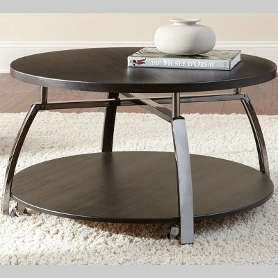 The Steve Silver Co. Coen Cocktail Table is as functional as it is chic. It features a contemporary feel with a bold design and double shelf that will compliment the other pieces of furniture in your living room. The cherry wood finished coffee table is beautifully mixed with silver legs and moveable wheels. Place a stunning bouquet of flowers, coasters and magazines on the classy cocktail table to set the tone of your living room.