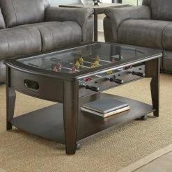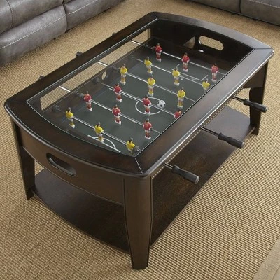 This Diletta Foosball Cocktail Table from Steve Silver Co. offers a totally unique take on traditional living room furniture. Constructed of wood in a dark finish, this cool coffee table has an inset foosball game, complete with handles and ball-retrieval bins. The tempered glass tabletop allows you to watch the action while offering a stable place to put drinks and snacks, and the bottom shelf lends extra storage space for games or books. The table is set on rolling casters that make it easy to move around, and you’ll love the easy entertainment option it adds to your home.