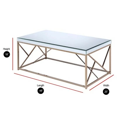 Add a touch of glam to your living space with this Evelyn Cocktail Table from Steve Silver Co. This rectangle cocktail table has a beveled-glass tabletop and is surrounded with a mirrored finish that offers a dimensional element, and the gold-tone metal frame lends shine and contrast for a stand-out look. Slanting braces provide extra visual interest, and the 48-inch length makes it ideal for a variety of rooms.