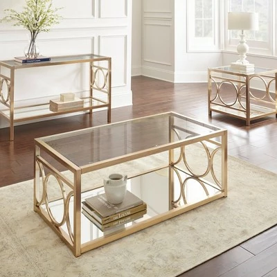 You will be spellbound by the stunning design of the Olympia collection. The gleaming gold chrome finish blends with the tempered glass top and mirrored base to create a cocktail table unlike any other. The modern design and circular side design will be the highlight of your living space. Your purchase includes one cocktail table.