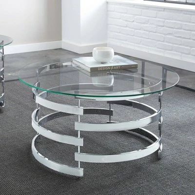 Contemporary style meets functionality with this Teegan Coffee Table from Steve Silver Co. This circular coffee table has a unique cut-out shiny chrome frame that creates an open and airy design. It has a tinted glass top that’s perfect for displaying decor or holding a book and a cup of coffee. This circular glass and chrome coffee table is the perfect addition to any living space in your home with its sleek and bold design.