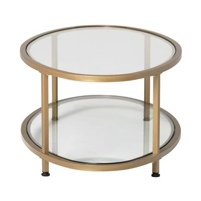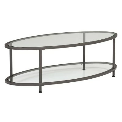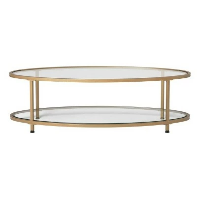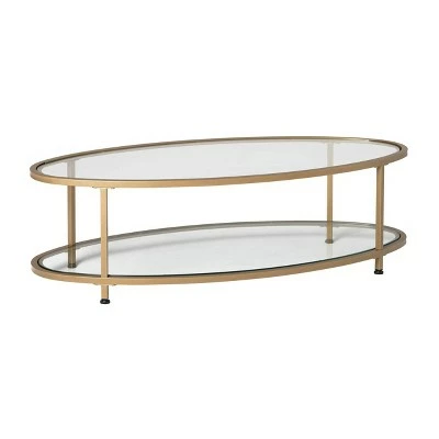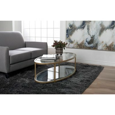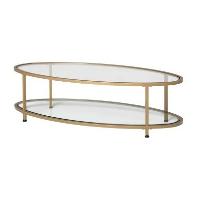 The Camber Collection of occasional tables by Studio Designs Home offers occasional tables with a simple, modern design that will complete your living room. The space-saving oval shape of this cocktail table makes it perfect for apartments or smaller homes. The Camber Oval Coffee Table combines a stylish gold metal frame with clear tempered glass. The simple lines and striking color easily complement your home’s decor. Floor Levelers are included for stability on any flooring surface.