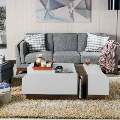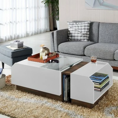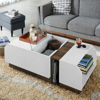 Create a fresh and modern seating ensemble around this Tammers Coffee Table from Homes: Inside + Out. The eye catching two-tone look pairs crisp solid white with bands of dark finished wood for a look full of visual style. Borrowing from Mid-Century Modern fare, it reflects a nuanced design with modular flavor. This white coffee table features a variety of storage options with a glass top compartment within the top surface and open shelving in the center and on its sides.Overall Width: 48.82 inchesOverall Depth: 24.8 inchesOverall Height: 15.75 inchesLeft Open Shelf Inside Depth: 10.98 inchesRight Open Shelf Inside Depth: 17.83 inchesOpen Shelf Inside Height: 10.47 inchesOpen Shelf Inside Width: 23.62 inchesBase Depth: 21.26 inchesBase Width: 45.12 inchesBase Height: 3.94 inchesCenter Open Shelf Width: 4.88 inchesCenter Open Shelf Height: 13.39 inchesCenter Open Shelf Depth: 21.42 inchesClosed Shelf Width: 11.85 inchesClosed Shelf Depth: 23.62 inchesClosed Shelf Height: 10.71 inches
