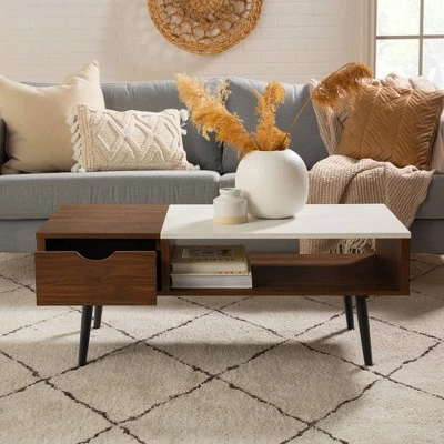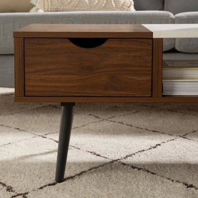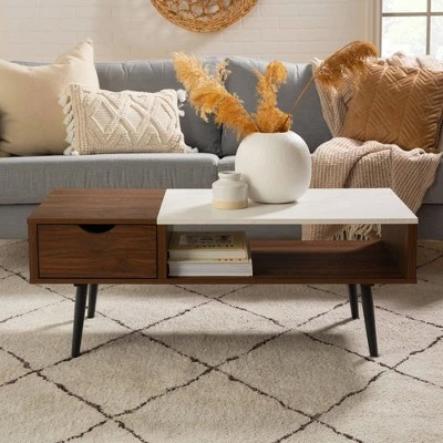 Add a sense of character into your living room with this mixed material two-tone coffee table from Saracina Home. The faux white marble finish on the table top over the open shelf creates a fancy flourish while the angled metal legs anchor its mid-century inspired design. Its boxy silhouette is dynamic and not only features a shelf but also a drawer where you can tuck away remotes, snacks or other personal effects. Functional and bold this coffee table works well in small space living situations.