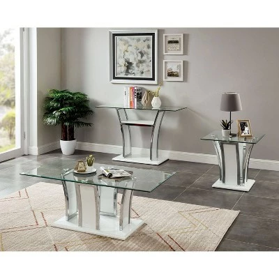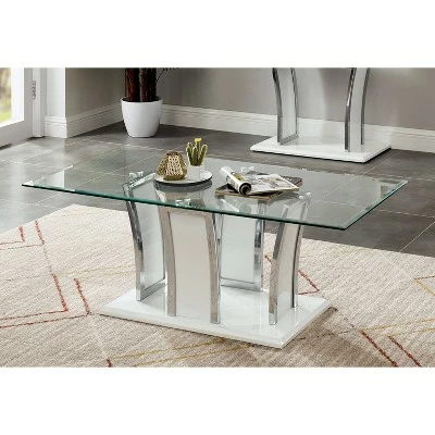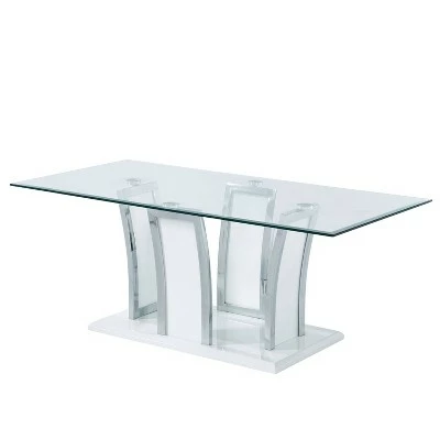 A sophisticated combination of lines and curves highlight this modern wood and metal coffee table. The sweeping sides of the curved white lacquer-coated legs are trimmed in vibrant chrome, beautifully offsetting the glossy white rectangular base and a rectangular beveled glass top that elevates the look and create a modern feel for any den or living room.