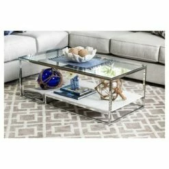 The Tressie Chrome Coffee Table in White from HOMES: Inside + Out is a classy, modern design that will update any space. The sleek, chrome frame and open base create a light, airy feel. A grooved and textured black shelf provides an eye-catching feature, while providing useful storage and display space. Set glasses down on the gorgeous, tempered glass top which adds a lovely, contemporary flare to a striking, modern design. HOMES: Inside + Out Tressie Chrome Coffee Table in White will compliment any design style and keep you and your guests wanting more.
