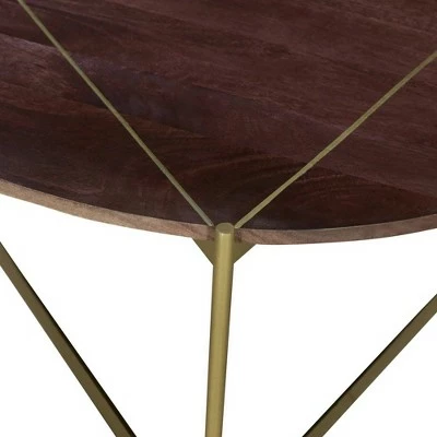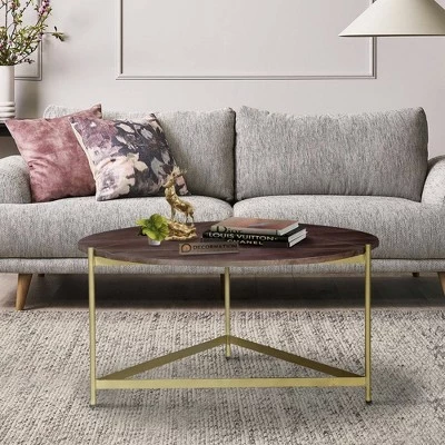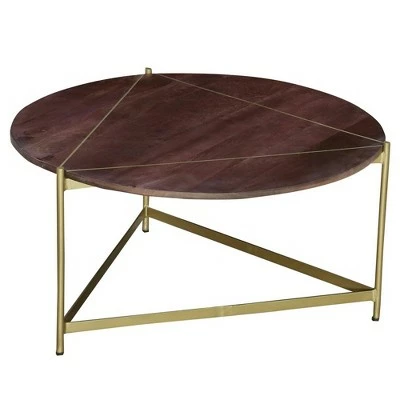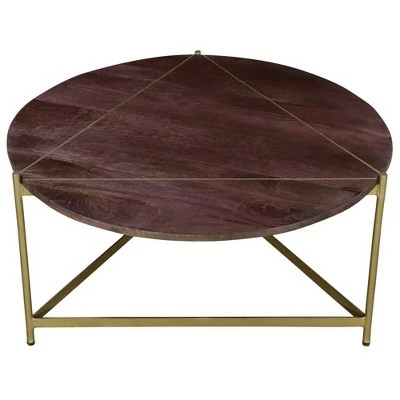Exquisitely designed, this striking Round Coffee Table is sure to add an enthralling flair to the aesthetics of your interior. Featuring a wide round shape tabletop to render services hassle free and conveniently, the reinforced tubular frame forms a triangular shape base. Constructed sturdily from the combination of mango wood and Iron frame for lasting durability, the dual tone finish in the hues of brown and brass emanates an essence of grandeur from it. Exhibiting the aesthetically visible grain details for a nature inspired appeal, this Coffee Table blends in with a variety of decor settings to become an integral part of the interior. Enjoy your scrumptious snacks and beverages on this striking Round Coffee Table.