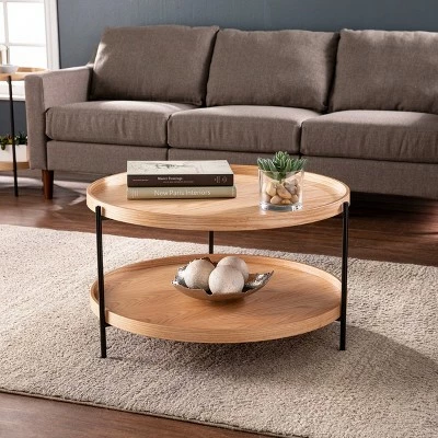 Farmhouse style goes chic with the Aiden Lane Vermicelli Round Farmhouse Style Cocktail Table. Lipped tabletop edges save your coffee cup from accidental spills, while raised shelf edges corral magazines and extra remotes. A sleek finish and slender legs keep your country look modern and minimalist, letting rustic décor or family photos shine. Give your home a fresh update when you slide this two-tier cocktail table alongside your living room sofa to hold game night essentials or your movie marathon snacks.