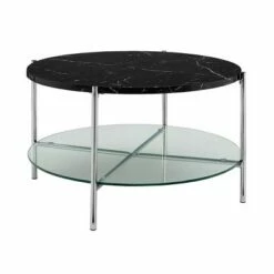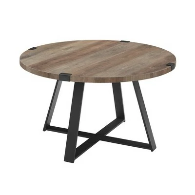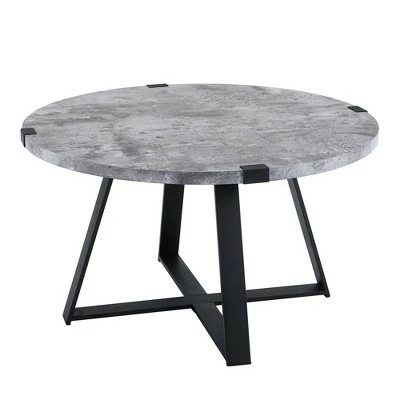 Our round coffee table provides an ideal spot to place your books, magazines, or fresh flowers upon with an urban industrial look. Metal legs wrap around the table top giving it structure and stability. Sanded black painted metal make up the base, with gorgeous grain detailing on the laminate table top surface, for an overall rustic appeal perfect for your living room.