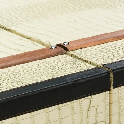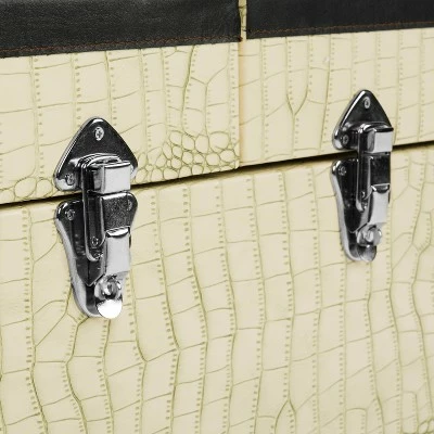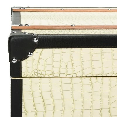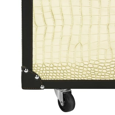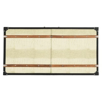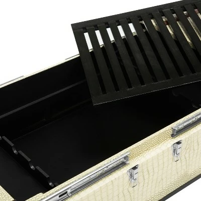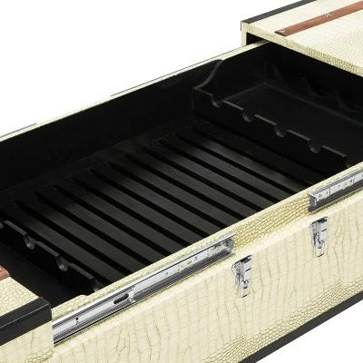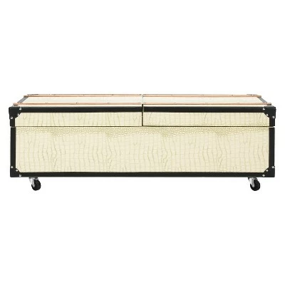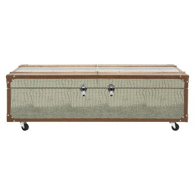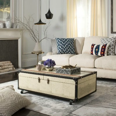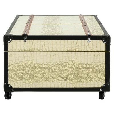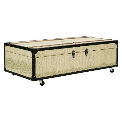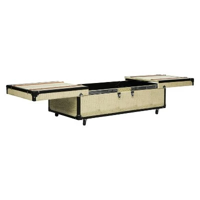 Luggage from the Golden Age of travel inspired the classic steamer trunk look of this retro coffee table. Designed with easy sliding access and a built in wine bottle rack, this immense storage piece can be transported from room to room with its smart casters. Perfect for organizing the living room or media room. Strikingly simple, this hardworking piece of home furniture maximizes storage with a hidden wind rack inside the trunk shaped coffee table. The Zoe coffee table is the perfect addition for Glam, Modern or Transitional style interiors.